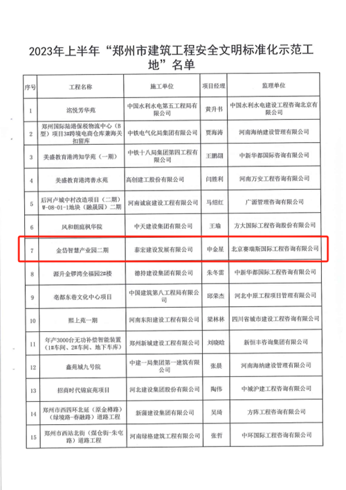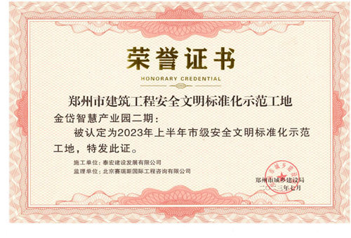 近日,經(jīng)鄭州市城鄉(xiāng)建設(shè)局評(píng)選,河南鄭地科創(chuàng)產(chǎn)業(yè)發(fā)展有限公司投資建設(shè)的金岱智慧產(chǎn)業(yè)園二期項(xiàng)目榮獲“2023年上半年鄭州市建筑工程安全文明標(biāo)準(zhǔn)化示范工地”榮譽(yù)稱(chēng)號(hào)。