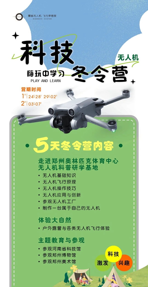 鄭州奧體翼能無人機研學(xué)基地是集無人機科普、研學(xué)、開發(fā)、應(yīng)用、賽事運營的綜合服務(wù)平臺,不僅擁有1000余平方米的無人機科普教育基地,還擁有無人機駕駛執(zhí)照的培訓(xùn)資格。寒假期間,依托鄭州奧體中心開闊場館,翼能無人機將科普知識與實操表演完美結(jié)合,分別開設(shè)1至5天不等的科技冬令營,代領(lǐng)孩子們放飛科技夢,在嗨玩中學(xué)習(xí)。