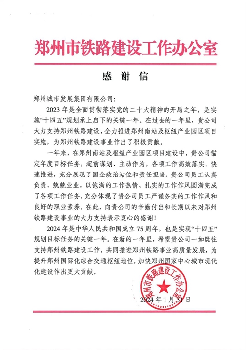 同時,城發(fā)集團大力支持鄭州鐵路建設(shè),全力推進鄭州南站及樞紐產(chǎn)業(yè)園項目實施,超前謀劃、主動作為,各項工作高效落實、快速推進,充分展現(xiàn)了國企政治站位和責(zé)任擔(dān)當(dāng)。做一件好事,添一份美麗 ,再收到鄭州市鐵路建設(shè)工作辦公室的感謝信!