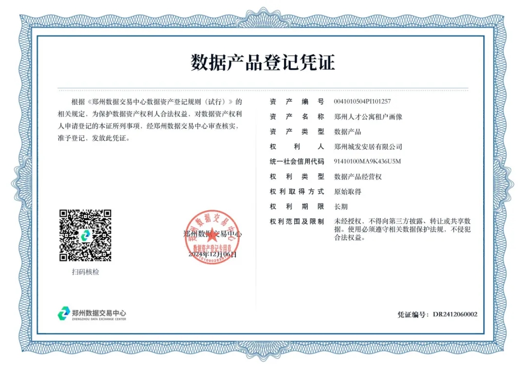 12月6日,鄭州城市發(fā)展集團(tuán)有限公司下屬子公司鄭州城發(fā)安居有限公司(以下簡稱“城發(fā)安居”)在鄭州數(shù)據(jù)交易中心成功完成了“鄭州人才公寓租戶畫像”的資產(chǎn)登記,正式取得數(shù)據(jù)產(chǎn)品登記憑證,成為鄭州首例將人才公寓運營數(shù)據(jù)資產(chǎn)入表的市屬國企。