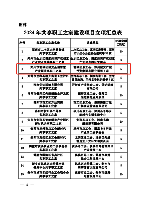 近日,河南省總工會發(fā)布《關(guān)于2024年共享職工之家建設(shè)項(xiàng)目立項(xiàng)的通知》,決定對城發(fā)金岱智慧產(chǎn)業(yè)園共享職工之家等32個(gè)共享職工之家建設(shè)項(xiàng)目進(jìn)行立項(xiàng),并對城發(fā)金岱智慧產(chǎn)業(yè)園共享職工之家給予資金補(bǔ)助,鄭州市僅有三家職工之家獲得立項(xiàng),這是城發(fā)金岱智慧產(chǎn)業(yè)園共享職工之家建設(shè)運(yùn)營后取得的第一份殊榮。
