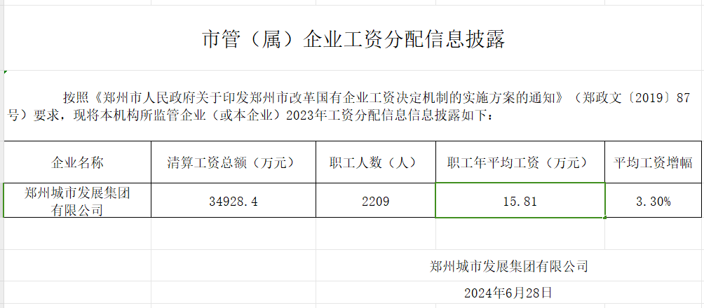 鄭州城市發(fā)展集團(tuán)有限公司2023年薪酬情況