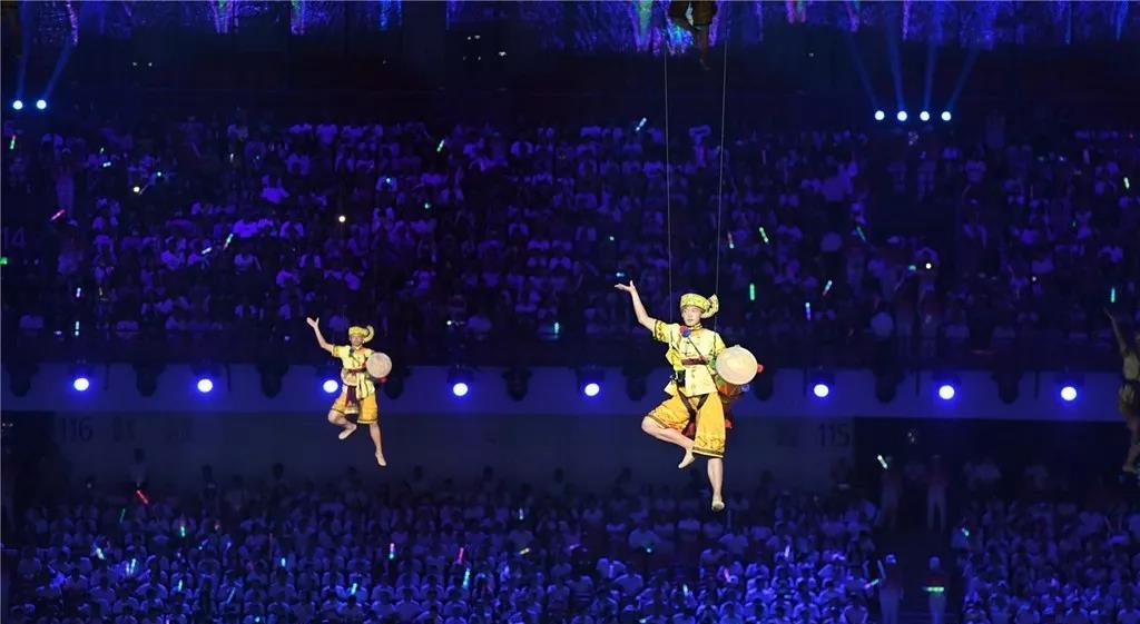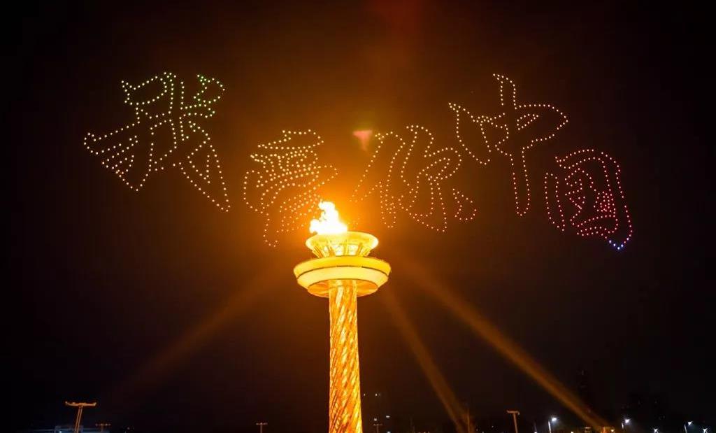 當(dāng)現(xiàn)場(chǎng)屏幕通過(guò)虛擬技術(shù)應(yīng)用,呈現(xiàn)出美麗的畫(huà)面,讓現(xiàn)場(chǎng)觀眾仿佛置身北國(guó)北川、南嶺飛瀑之中,觀眾都情不自禁地?fù)]舞起了手中的國(guó)旗為他們的表演喝彩!為我們偉大的祖國(guó)喝彩!1000架無(wú)人機(jī)從奧體中心廣場(chǎng)升起迅速變換成中中的造型,點(diǎn)燃民族運(yùn)動(dòng)會(huì)的火炬。