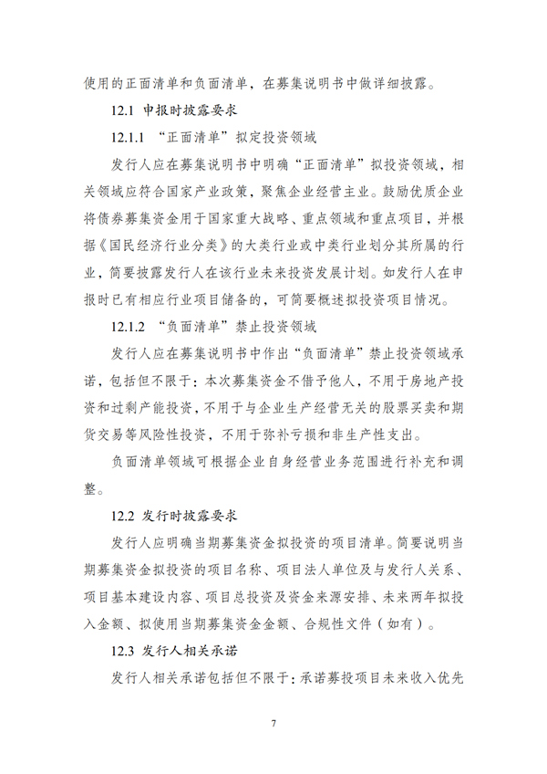 (二)申報(bào)材料應(yīng)明確債券募集資金禁止投向領(lǐng)域,形成“負(fù)面清單”。“負(fù)面清單”包括但不限于:將募集資金借予他人,用于房地產(chǎn)投資和過剩產(chǎn)能投資,用于與企業(yè)生產(chǎn)經(jīng)營無關(guān)的股票買賣和期貨交易等風(fēng)險性投資,用于彌補(bǔ)虧損和非生產(chǎn)性支出。“負(fù)面清單”領(lǐng)域可根據(jù)企業(yè)自身經(jīng)營業(yè)務(wù)范圍進(jìn)行補(bǔ)充和調(diào)整。
